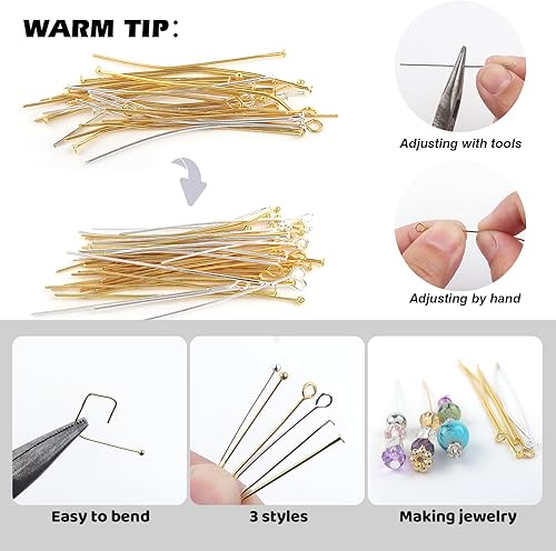 TOAOB 300pcs Aiguilles Tiges Clous a Tete Ronde et Plate en Métal Épingle à Oeil Argent Or Longueur 50mm Diamètre 0.7mm pour Accessoire Fabrication de Bijoux Artisanat
