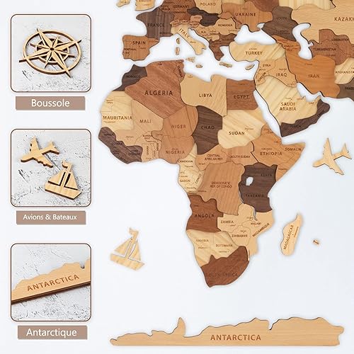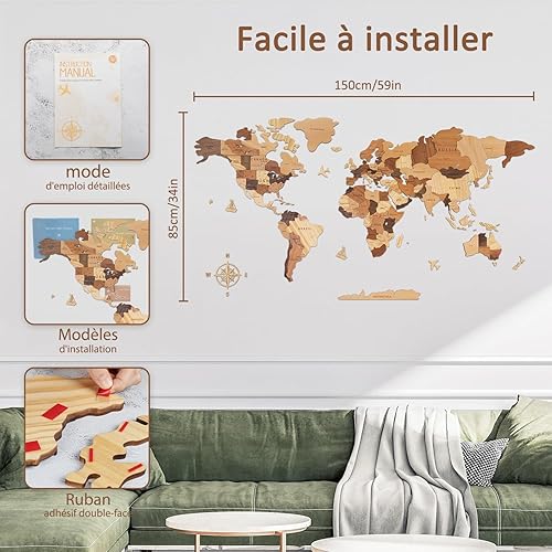 Creawoo Carte du Monde de Voyage 3D en Bois pour Décoration Murale, Carte Murale Décorative en Bois Massif Naturel Multicouche pour la Maison et le Bureau, Multicolore-150x85 CM