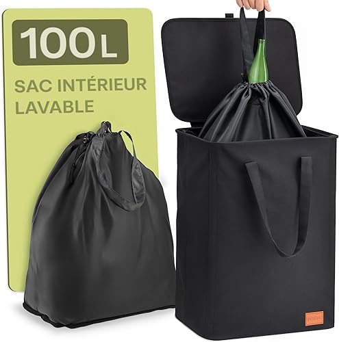 Poubelle de Tri Sélectif 100L - Collecteur de Bouteilles pour Recyclables & Verre - Poignées Doubles - Cordon Sécurisé - Résistante à l’Eau avec Sac de Transport - pour Cuisine & Balcon