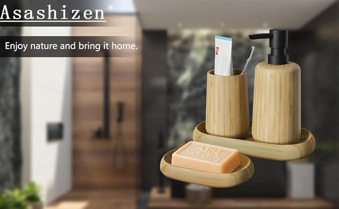 Asashizen Lot de 4 accessoires de salle de bain rétro en bambou - Porte-savon, distributeur de savon, plateau, tasse de bain de bouche pour maison, bureau, hôtel, salle de bain