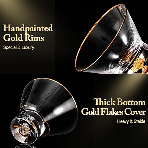 DUJUST Lot de 4 verres Martini de luxe avec bord doré (8oz), verres à cocktail sans pied en cristal avec paillettes de feuilles d'or 24K, verres à margarita pour bar à domicile, sans BPA ni plomb