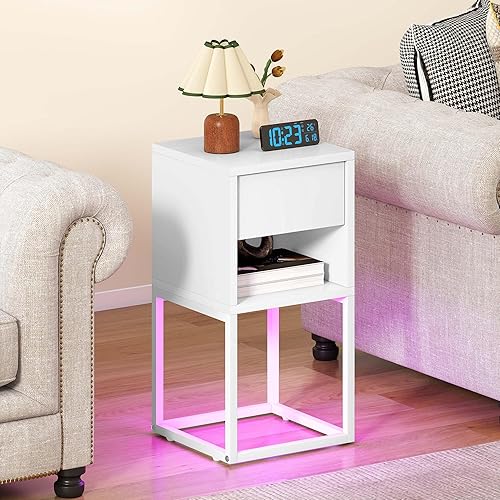 DWVO Lot de 2 Tables de Chevet LED avec tiroir et Table Basse Ouverte à 3 Niveaux avec étagère Ouverte, Fonctionne comme Table de Nuit, Convient pour Chambre à Coucher, Salon, Blanc