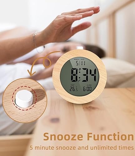 Yulado Reveil, Horloge Numérique Rond LCD en Bois, avec Affichage Date, Température, Rétroéclairage, Snooze, Réveil Matin