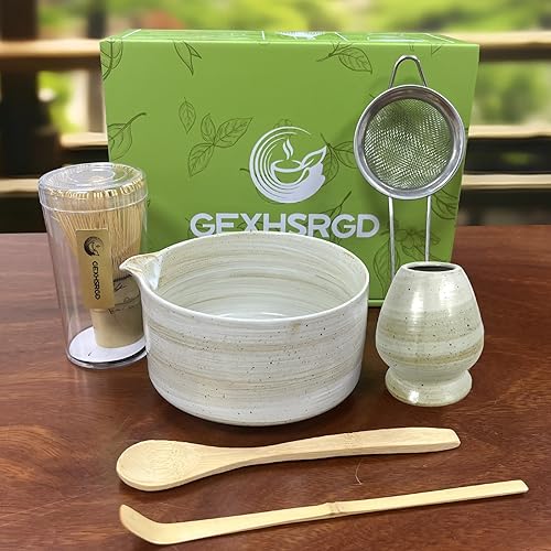 GEXHSRGD Ensemble de fouet à matcha, le kit comprend un fouet à matcha et un support, un bol à matcha avec bec verseur, un tamis à matcha et 2 cuillères à matcha(Gris)