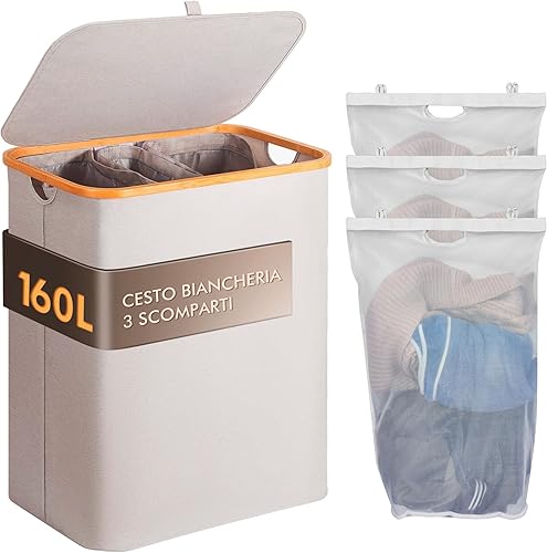 Tiklife Panier à linge 3 compartiments, 150 l, bambou naturel, panier à linge extensible, peut être utilisé dans la cuisine, le salon, la salle de bain et d'autres endroits (100L gris)
