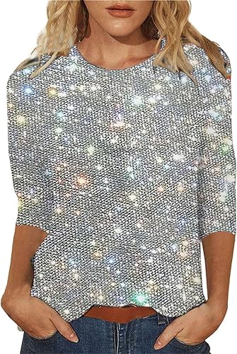 Hauts à paillettes pour femme - T-shirt à manches longues décontracté - Col rond - Hauts scintillants - Avec paillettes brillantes - T-shirt - Haut - Bal de fin d'année - Fête de carnaval, argenté, L