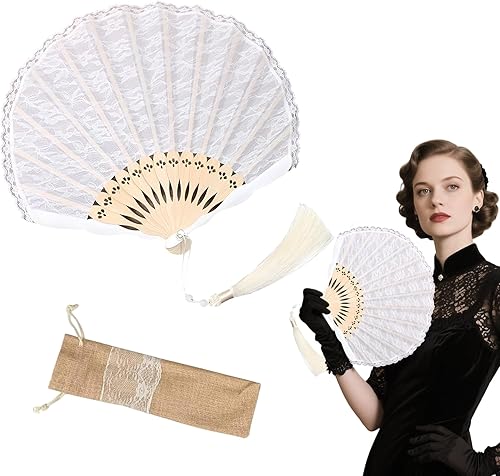 Éventail à main en dentelle blanche - Éventail de mariage - Éventail de mariée - Éventail pliable - Éventail de danse pour mariage - Avec sac cadeau en lin - Pour danse, mariage, fête (style1)