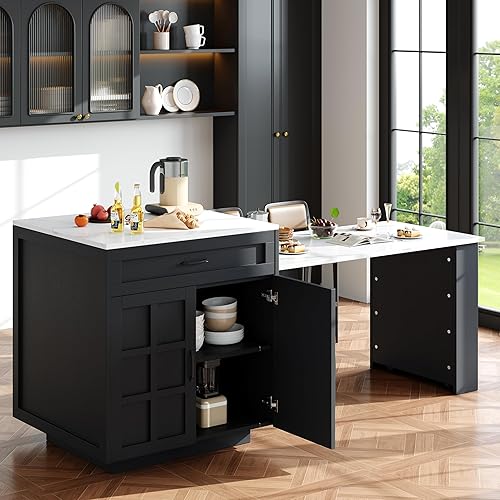 Zepneiy Table de Bar Extensible avec Espace de Rangement (110-124×78×97,5 cm), avec 2 tiroirs, 2 étagères latérales Ouvertes et Prise de Courant intégrée, avec Plateau en Grain de Bois, Blanc