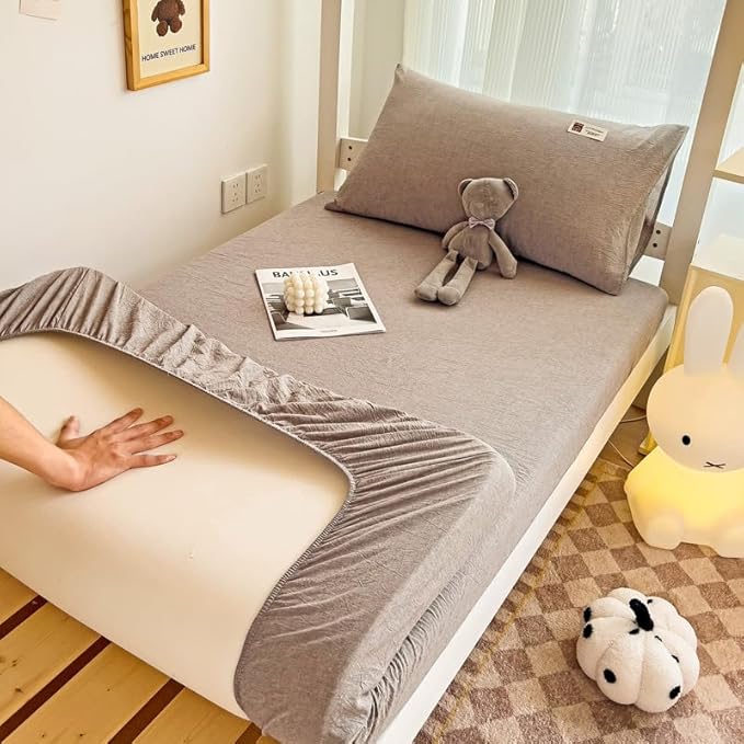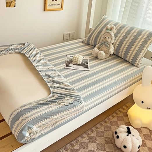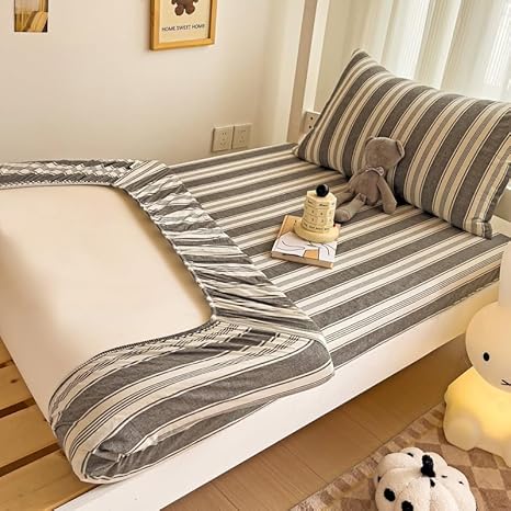 Drap-housse en coton à rayures – Protection de lit douce et respirante, antidérapante, élastique avec poche profonde, pour lits superposés pour dortoir d'étudiants (gris rayé, 90 x 200 cm)
