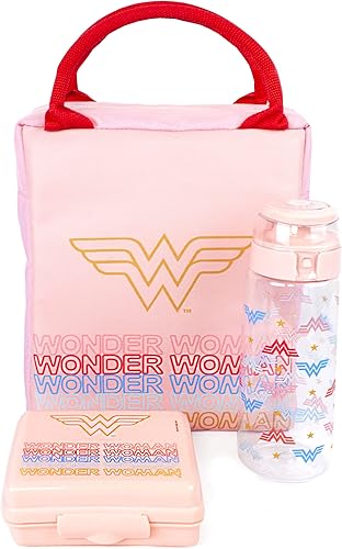DC Comics Wonder Woman Sac à déjeuner | Ensemble de 3 pièces de style fourre-tout rectangulaire avec bouteille d'eau et contenant à collation | Adoptez le pouvoir des super-héros