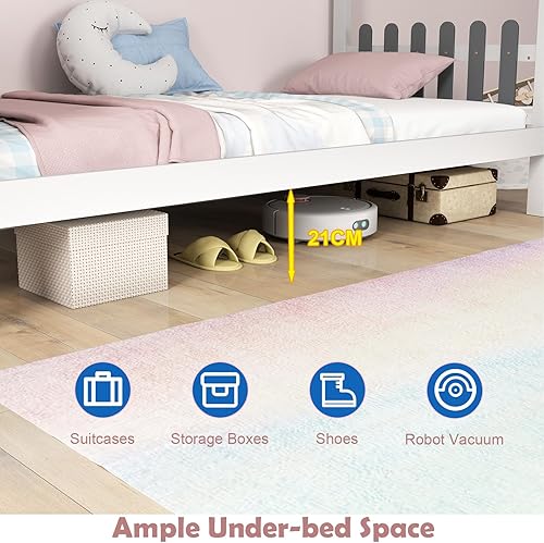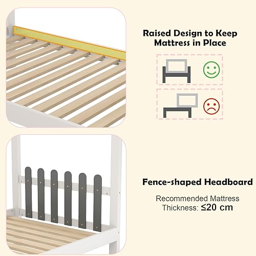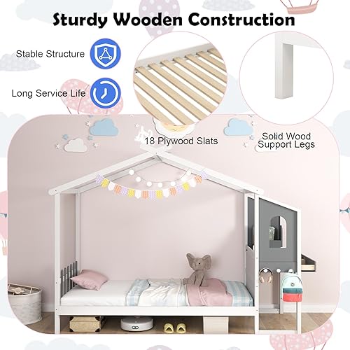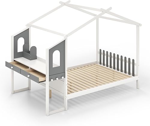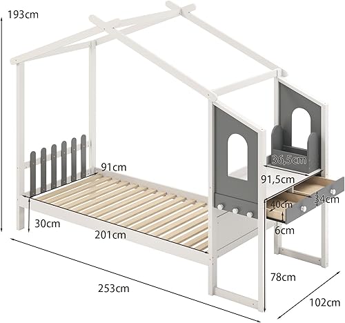 LIFEZEAL Lit Cabane Enfant avec Bureau, 2 Tiroirs, Organisateur de Rangement, 6 Crochets, Cadre de Lit avec Baldaquin, Sommier en Bois de Pin, Charge 150 kg (200x90 cm)
