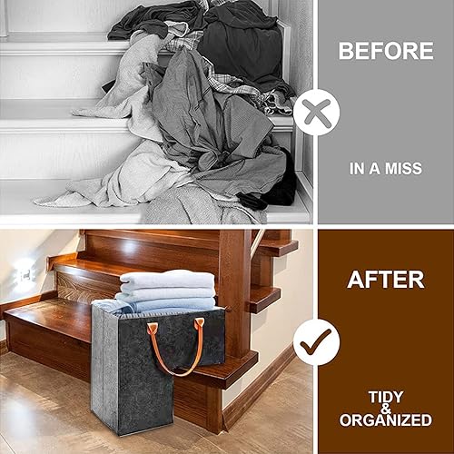 Panier d'escalier avec poignées en cuir, grand organisateur de rangement pliable en forme de L, organiseur de rangement d'escalier en feutre avec poignées, panier pliable pour décoration