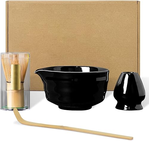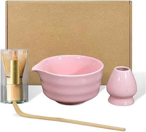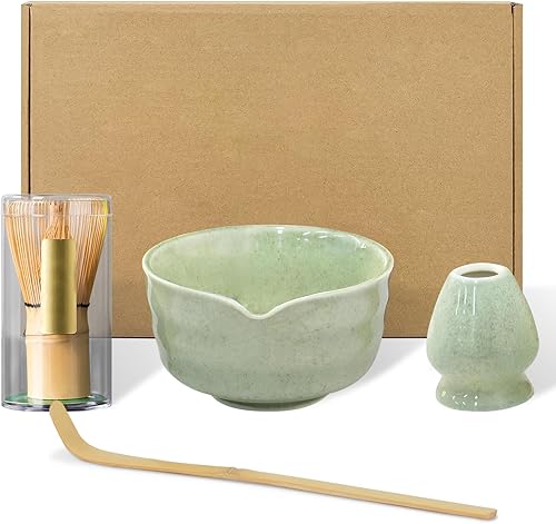 PZCC Ensemble de Matcha Japonais 4 Pièces, avec Fouet et Cuillère en Bambou, Bol Fait Main avec Bec Verseur, Support de Mélange en Céramique, Cadeaux Créatifs pour Les Amateurs de Matcha (Matcha Vert)