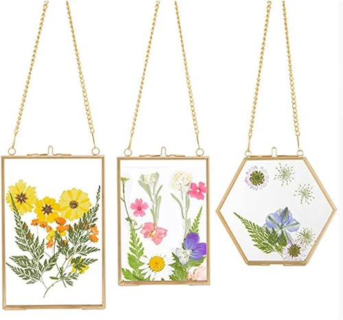 Tiamu Cadre Photo Verre, Cadre d'affichage Flottant pour Fleurs Pressées, Cadres Photo en Verre doré à Suspendre, Spécimen D'usine Clip pour fleurs motif plantes, Cadre Verre Mural pour Photo, Figure