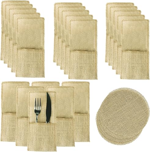 Yayatty Porte-Couvert en Toile Jute, 20 Pièces Porte Couverts Toile de Jute et 10 Pièces Napperon en Jute pour Soirée Repas Fête Mariage YA-0612