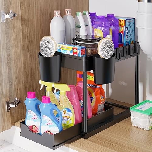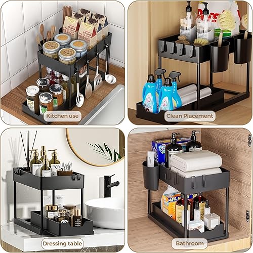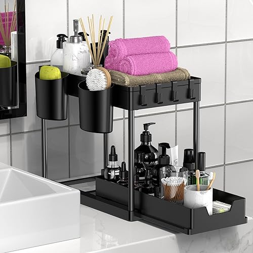 HIYAA Rangement sous Evier 2 Niveaux, Coulissant Organiseur sous Évier Etagere Tiroir,Panier de Rangement Multifonction pour Salle de Bain, étagère sous Placard, étagère de Lave-Vaisselle - Noir