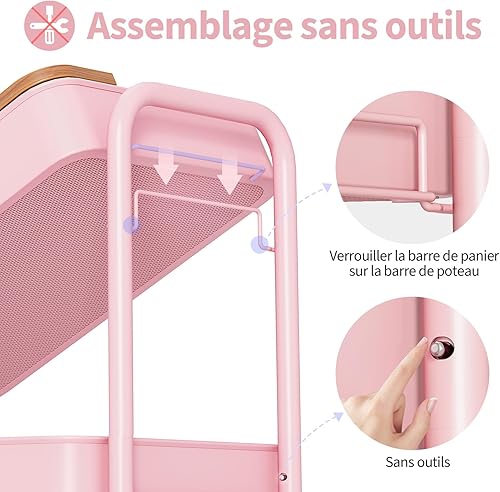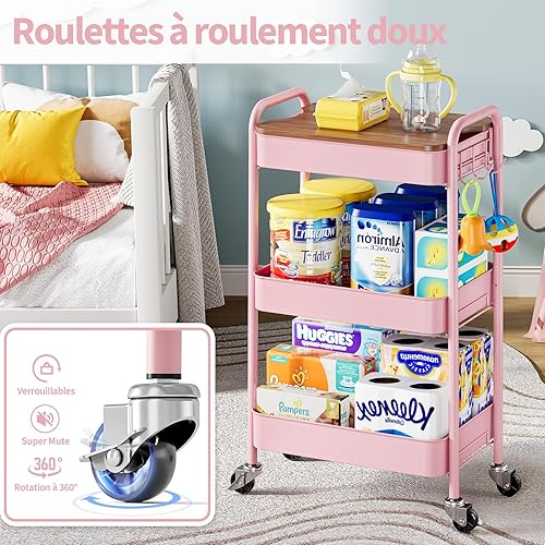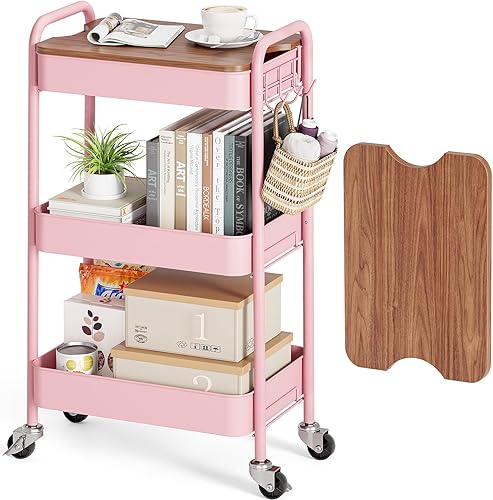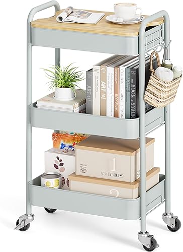 kingrack Chariot à roulettes à 3 niveaux, chariot utilitaire en métal avec plateau en bois amovible, chariot de rangement pour loisirs créatifs, chariot de service facile à assembler, vert