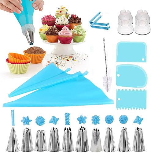 Douilles Pâtisserie, 20 Pièces en Acier Inoxydable DIY Kits, 10 Douilles, 2 poche à douille en silicone 2 Coupleurs, 3 cornes et peignes à gâteau, 2 adaptateurs, Brosse, Cupcakes et Cookies (bule)