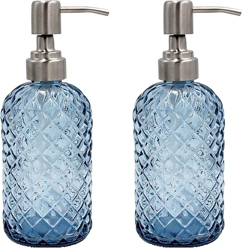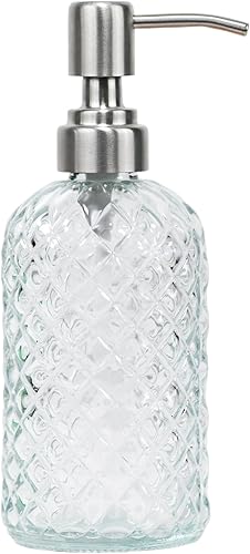 Distributeur de savon en verre à motif diamant de 473,6 g, distributeur de savon rechargeable pour cuisine et salle de bain avec pompe en acier inoxydable résistant à la rouille pour savon pour les