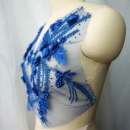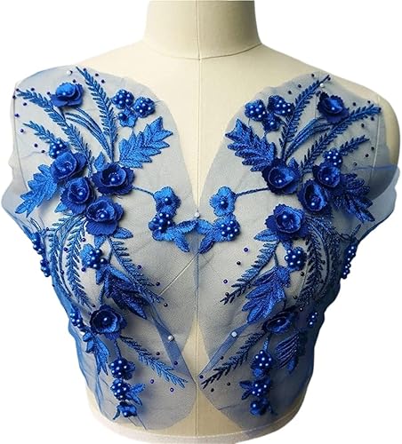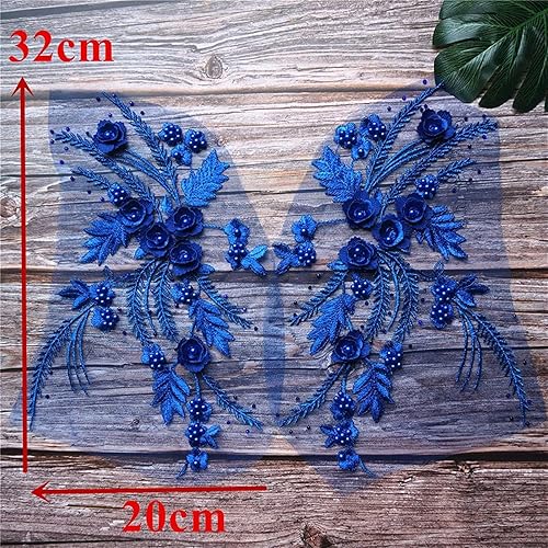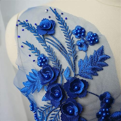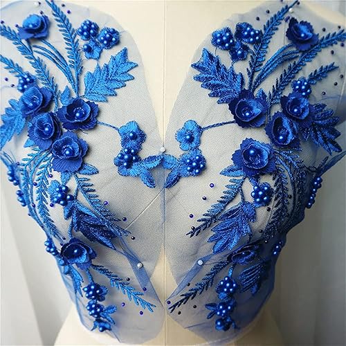 Appliques en tissu à coudre, Appliques de broderie, 2 pièces en dentelle bleu roi avec fleurs 3D, pompons, perles, strass brodés for robe de mariée, DIY