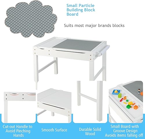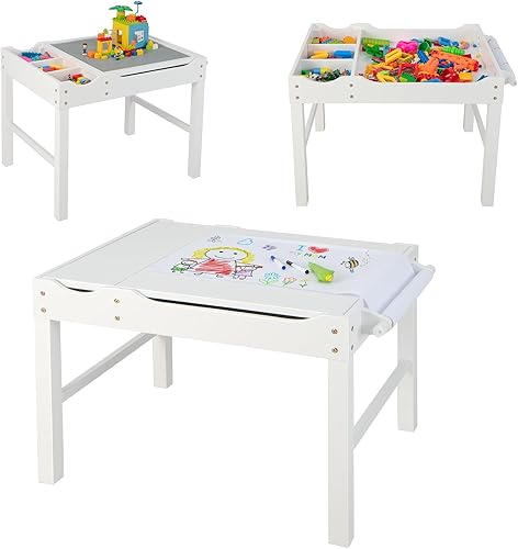 LIFEZEAL 2 en 1 Bureau à Dessin & Table de Blocs de Construction avec Espace de Rangement, Plateau Réversible, Rouleau de Papier, Table Multi-Activités en Bois pour Enfant 3 Ans+ (Blanc)