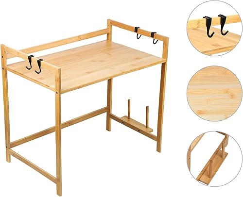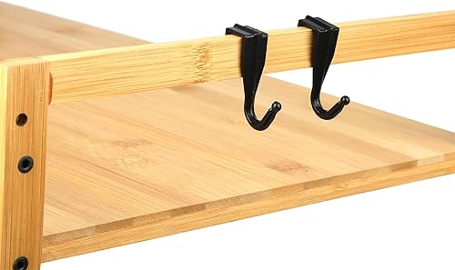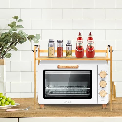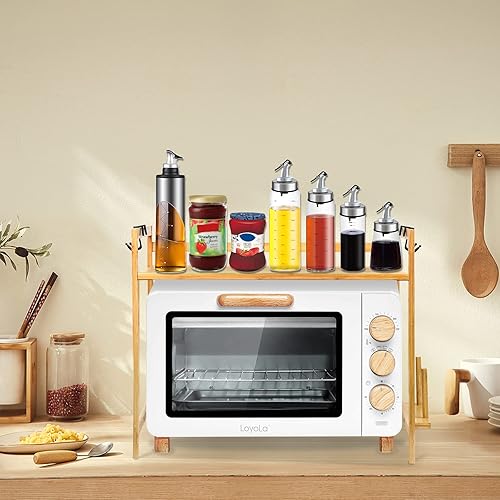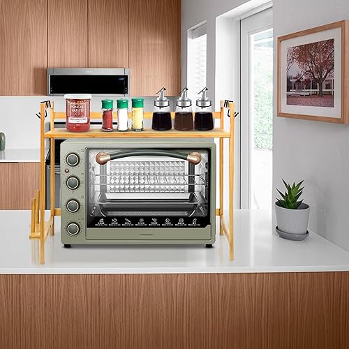 OHMG Étagère à Micro-Ondes,2 Niveaux en Bambou Organisateur Cuisine,Support pour Micro-Ondes,avec 4 Crochets,Rangement et Organisation de Cuisine (Bambou (52x37x65cm))