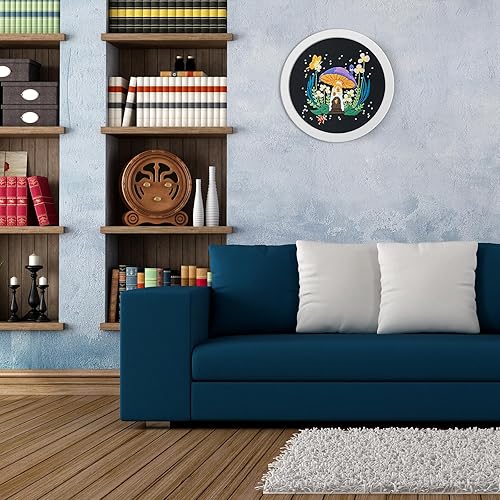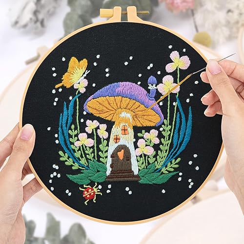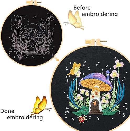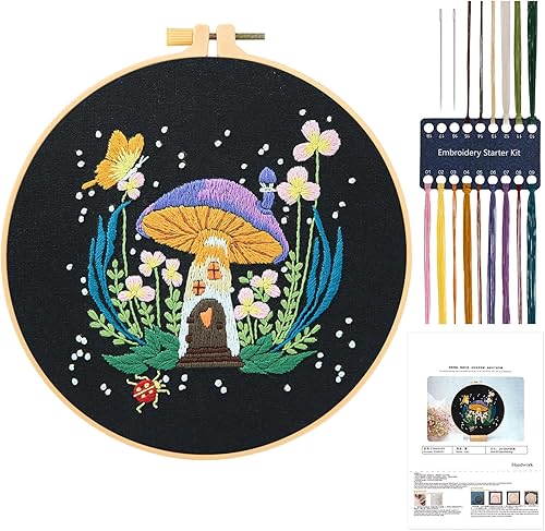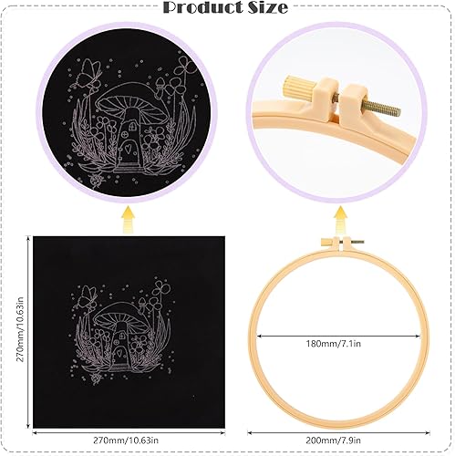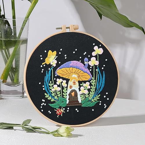 JSRQT Kit de Démarrage de Broderie pour Débutants, Embroidery Starter Kit avec Maison aux Champignons Motif,Kit de Broderie au Point de Croix Artisanal
