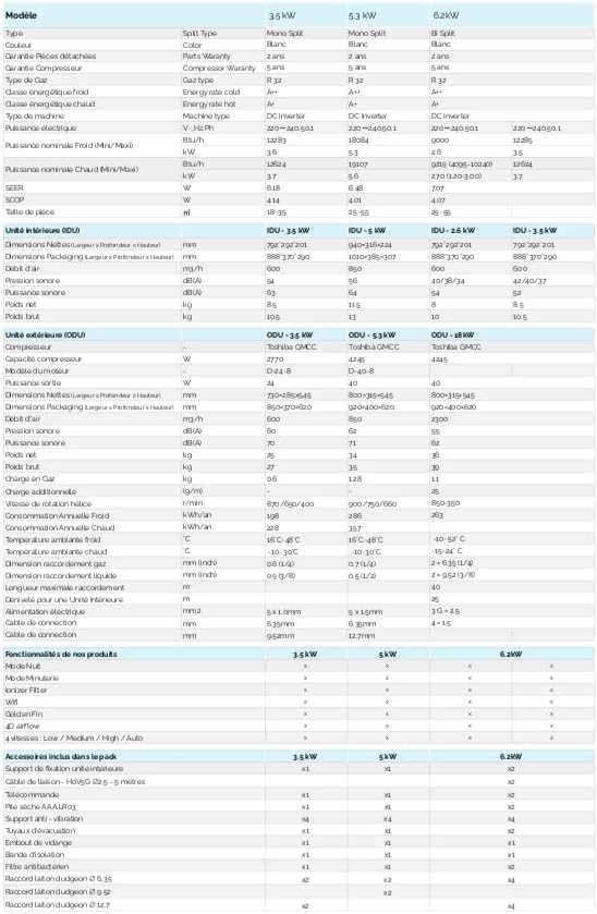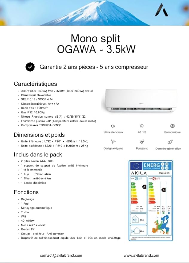 OGAWA - Climatiseur réversible fixe - Mono split - 3600W - 12000 BTU - 40 m2 - Gaz R32-4D Airflow - Golden Fin - Wifi