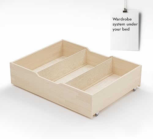 Hansales Tiroir de rangement 97,5x104x40cm sous lit en bois massif avec roulettes et compartiments, Coffre en bois pour lits hauts Anu et Triin de
