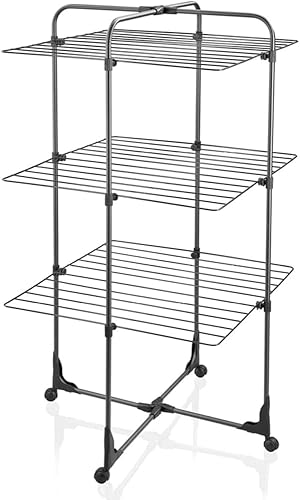 Leifheit Séchoir à linge tour Classic Tower 270 Black, étendoir à linge pliable noir à 3 niveaux, 27 mètres d'étendage avec cadres rabattables, demi-ouverture et roulettes 360°