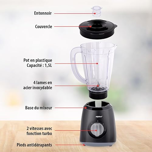 alpina Mixeur Blender 1.5L - Smoothie Mixer 400W - Machine a Smoothie avec Fonction Turbo et Pichet en Plastique - Lames en Acier Inoxydable - Noir