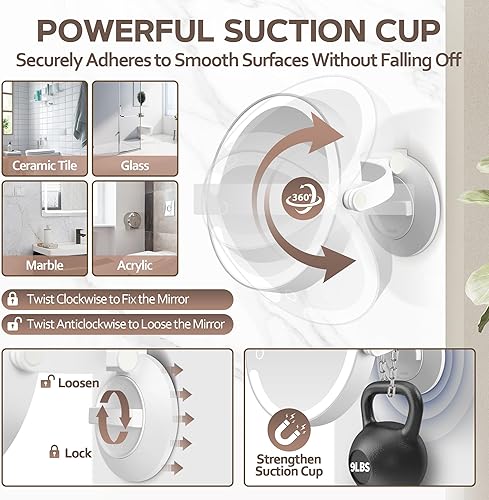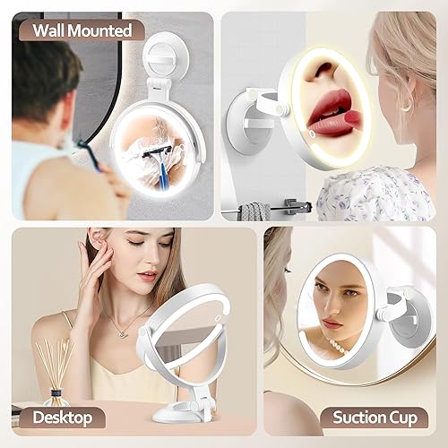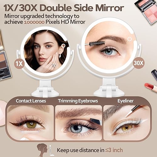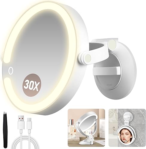 MOMOKUBA Miroir grossissant avec lumière 30X, miroir de salle de bain LED avec 3 modes d'éclairage, rotation double face 30x/1x, miroir de maquillage mural, miroir de maquillage rechargeable avec