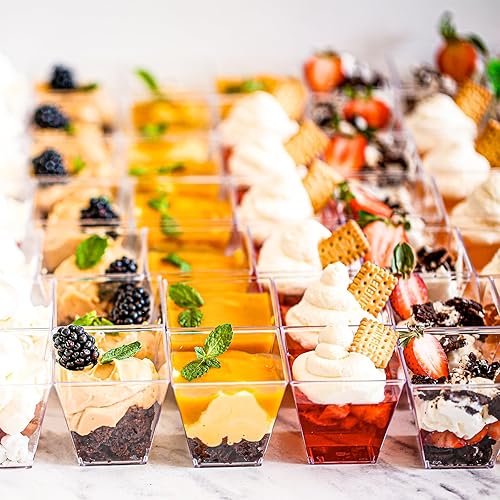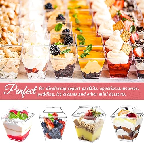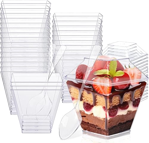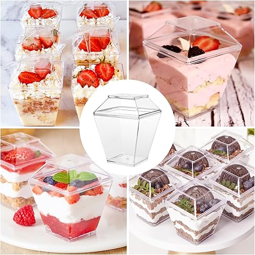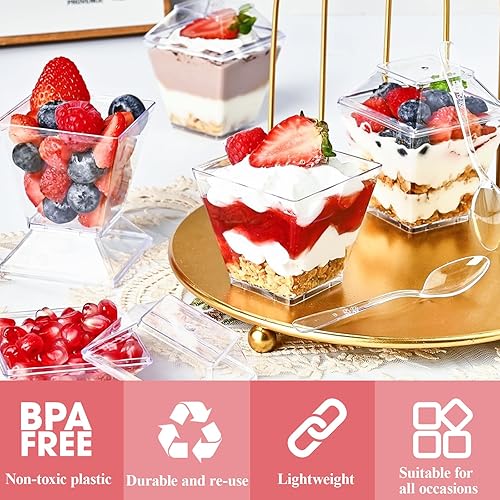 Dawumin 30 Pièces Verres à Dessert en Plastique de 60 ml, Réutilisables Avec 30 Couvercles et Cuillères, Transparents Carrés pour Pudding, Mousse, Crème Glacée, Anniversaire, Mariages