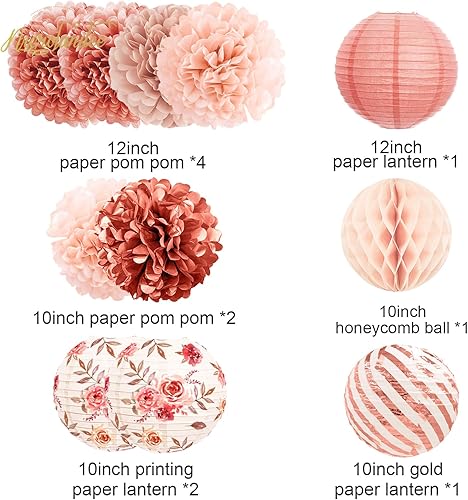 NICROLANDEE Lot de 12 lanternes en papier or rose - Pompons en soie - Confettis - Décoration pour fête de mariage, Saint-Valentin, fête d'anniversaire