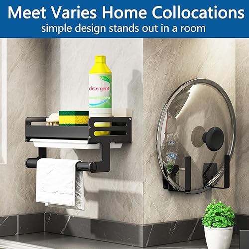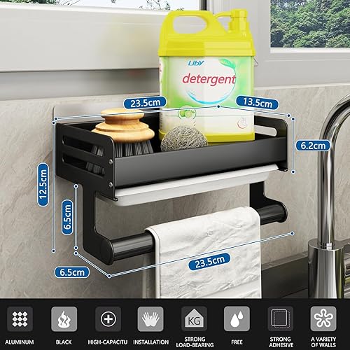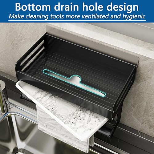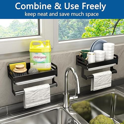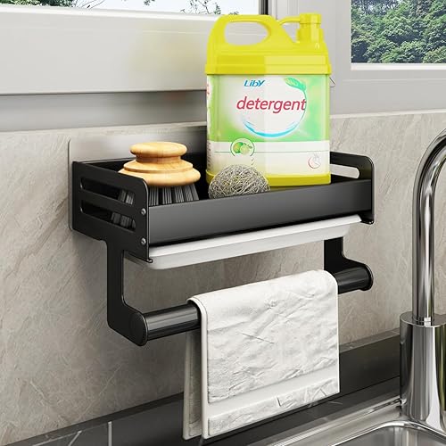 FOXWHALE Porte Eponge Evier Cuisine, Organisateur Evier Cuisine avec bac à Goutte et Porte - Serviettes, Auto-adhésif Support Eponge Evier Cuisine pour Éponge, Brosse de Nettoyage (Noir)