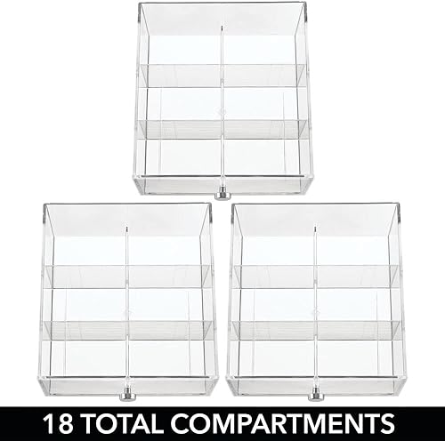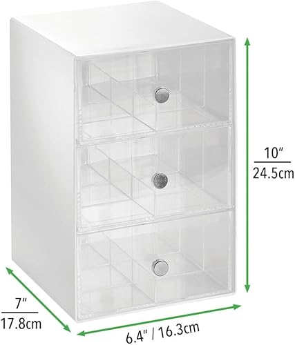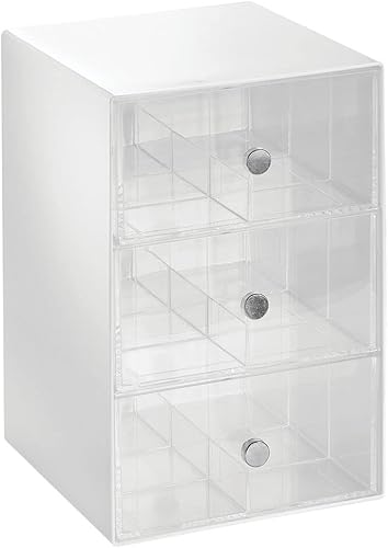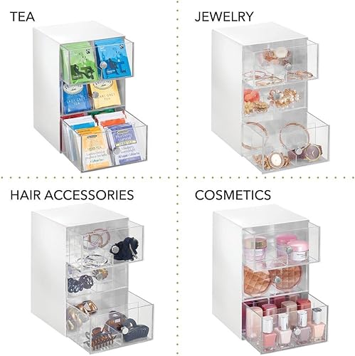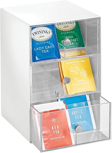 mDesign boite de rangement cuisine en plastique avec 3 tiroirs – casier de rangement pour sachets de thé, tisane, infusion, dosette café, etc. – boite à thé à 18 compartiments – blanc et transparent
