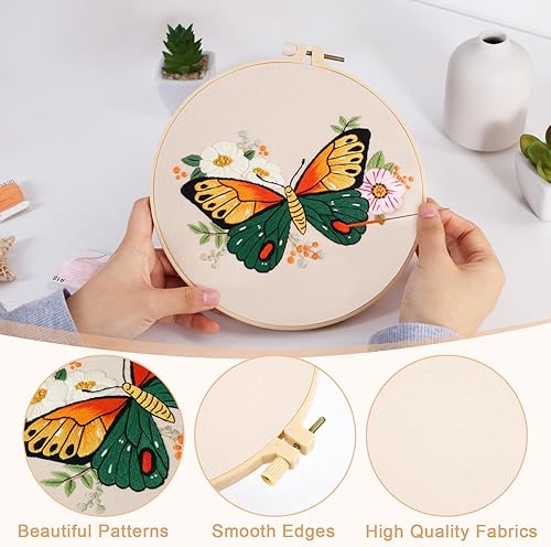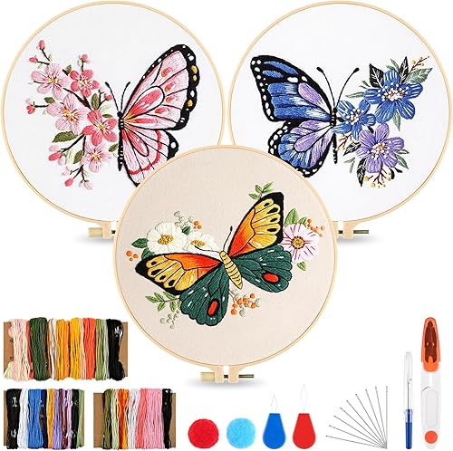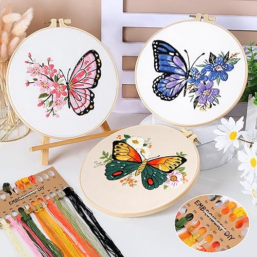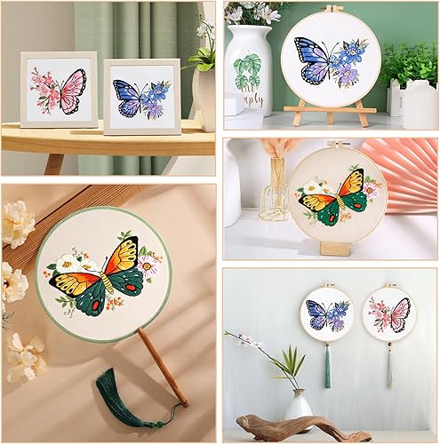 Kit de Démarrage de Broderie, 3PCS Kit d'Outils de Broderie Papillon, Kit de Broderie Débutant, Kit de Démarrage de Point de Croix, avec Instructions, 2 Cadres de Broderie, Fils de Couleur, Ciseaux