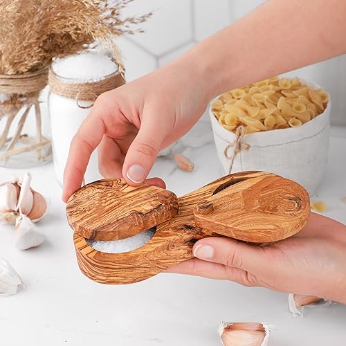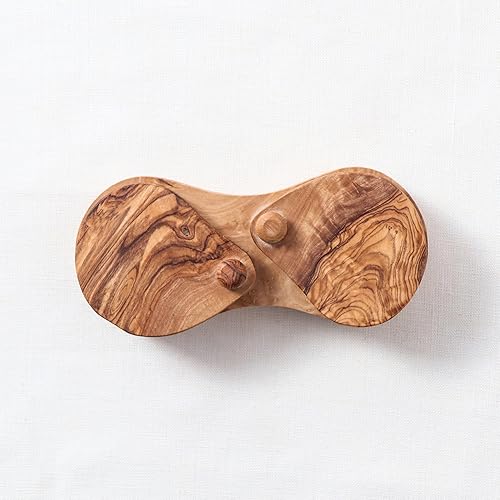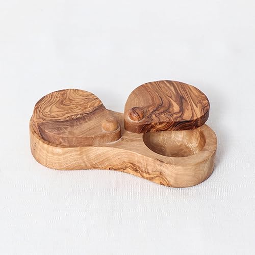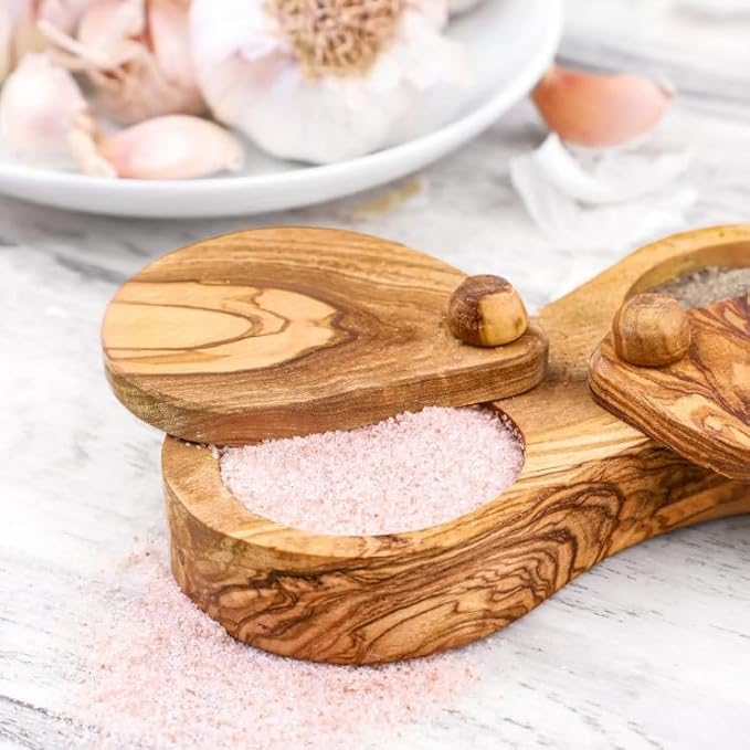 M'zaytouna Pots à épices en bois d'olivier - Double compartiment sel et poivre avec couvercle - 100% bio fait à la main, rustique, antibactérien et durable, en pur bois d'olivier