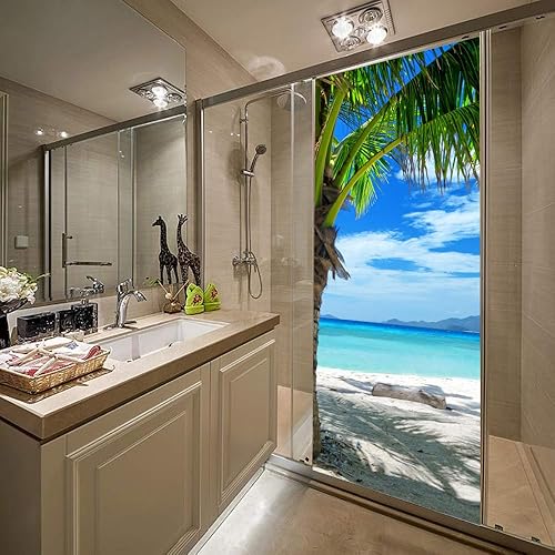 Sticker porte Trompe l'oeil Effect Papier Peint 3d pour Porte Photo Stickers Muraux Auto-adhésif Autocollants PVC Imperméable pour Chambre Salle de Bain Cuisine Décoration 63x205 cm Plage et Palmiers
