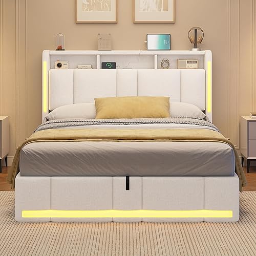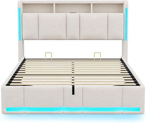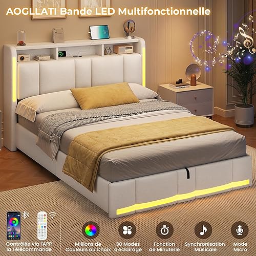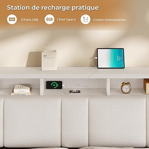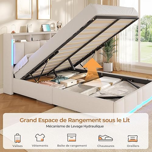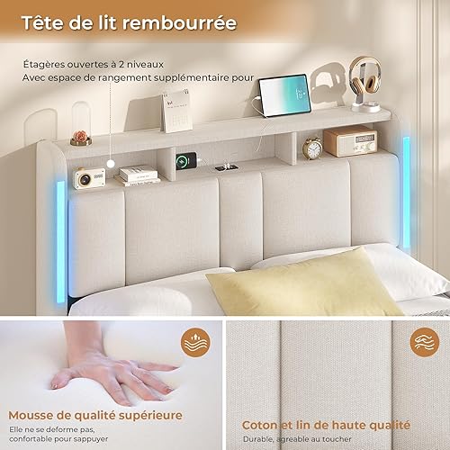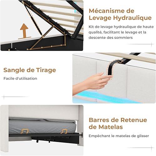 AOGLLATI Lit Coffre 140x190 CM, Lit Double avec LED et Ports USB, Cadre de lit avec Tête de Lit capitonné et Rangement, Lattes en Bois, Lin Gris Foncé(sans Matelas)