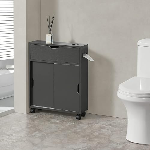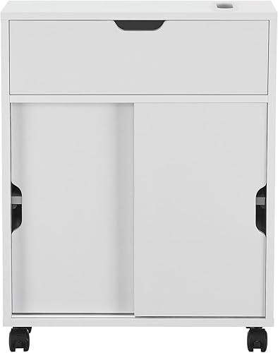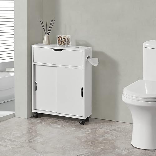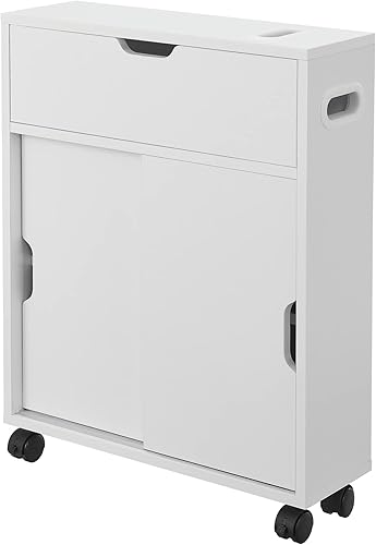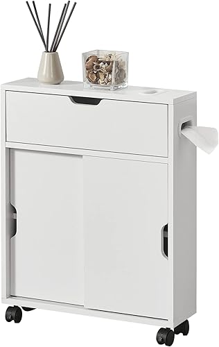 [en.casa] Meuble de Rangement de Salle de Bain sur Roulette Organisateur à Portes Coulissantes avec Fentes Panneau de Particules 67 x 52 x 17 cm Blanc