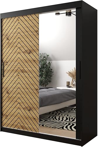 ABIKSMEBLE Armoire à Portes coulissantes Jodełka 2 180 Armoire avec Tringle et étagère Armoire avec Miroir de Chambre à Coucher (Noir Mat + Chêne Artisan + Noir Mat, Tiroirs: 0)