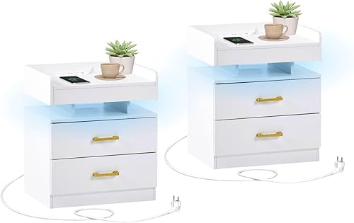 FurnitureR Lot de 2 Tables de Chevet LED - 45 x 35 x 52 cm - Blanc Brillant - 2 tiroirs - 16 Couleurs d'éclairage LED - 2 Prises de Charge et 2 Prises USB - pour Chambre à Coucher, Salon, Bureau
