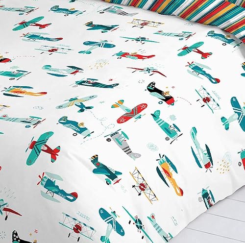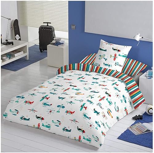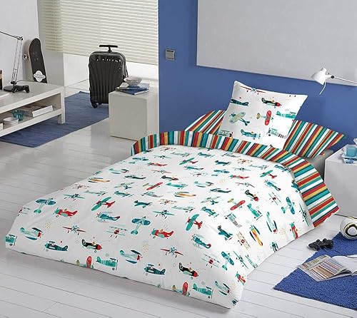 Housse de couette réversible pour enfant/adolescent Motif avions pour lit de 105 cm (180 x 260 cm largeur)