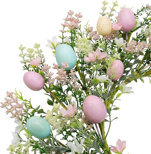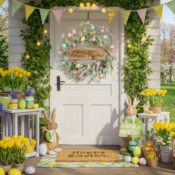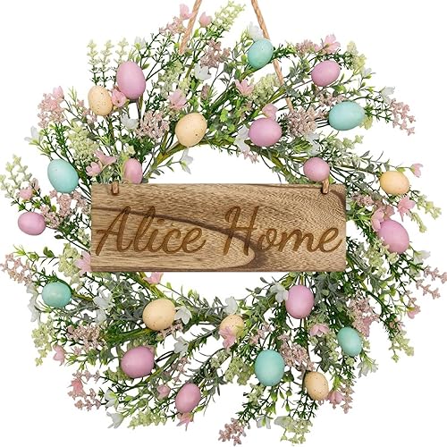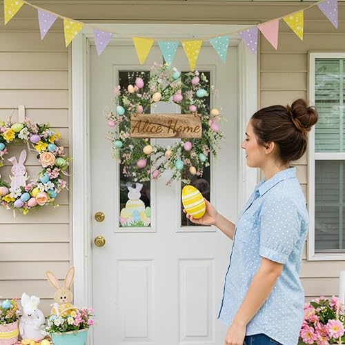 Couronne De Pâques, Couronne De Porte Personnalisée avec Plaque en Bois Gravée Au Laser – Décoration De Porte Printanière avec œufs Décoratifs, Fleurs Artificielles 45cm/18inch (Egg)