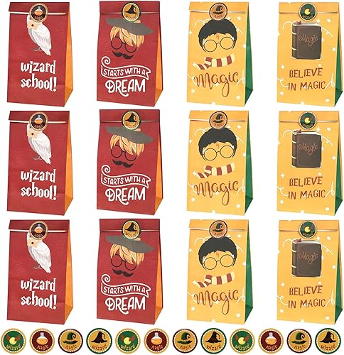 Sacs Cadeaux Magic Wizard - Pochette Cadeau 12 Pièces avec 2 Autocollants Mignons pour Anniversaire Enfant, Fêtes, Noël - Sachet Bonbons