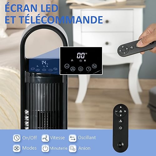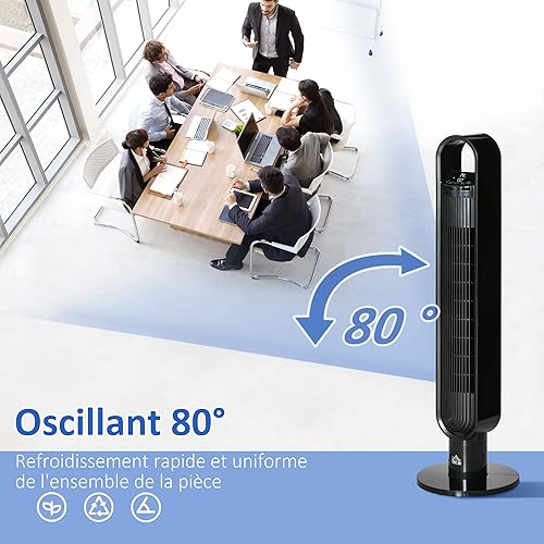 HOMCOM Ventilateur colonne à ions négatifs oscillant 80°, Ventilateur tour avec télécommande écran LED 60 W, minuterie de 12H, 3 modes 3 vitesses - noir