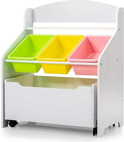 COSTWAY Coffre à Jouet Enfant avec 3 Bacs et 1 Tiroir à roulettes, Meuble Rangement Jouet en Bois avec Espace de Stockage, Design Moderne pour Jouets et Livres, 63,5 x 38 x 76,5CM