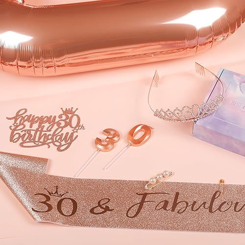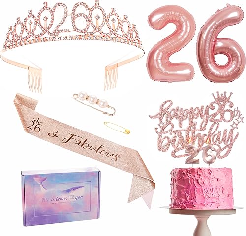 Kit de décorations pour 26e anniversaire en or rose, avec ceinture et diadème, couronne, gâteau d'anniversaire, chiffre 26, ballons en aluminium, bougies, cadeaux pour elle et femme