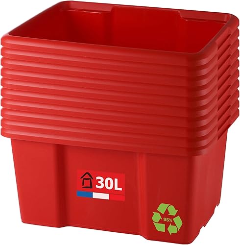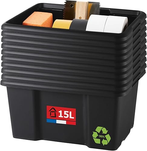 Sundis Bac de rangement 30L, lot de 10, en plastique recyclé noir, L.46,5xl.36,5x H23cm, empilable et superposable, multiusage, idéal pour l’atelier, le bricolage ou le transport